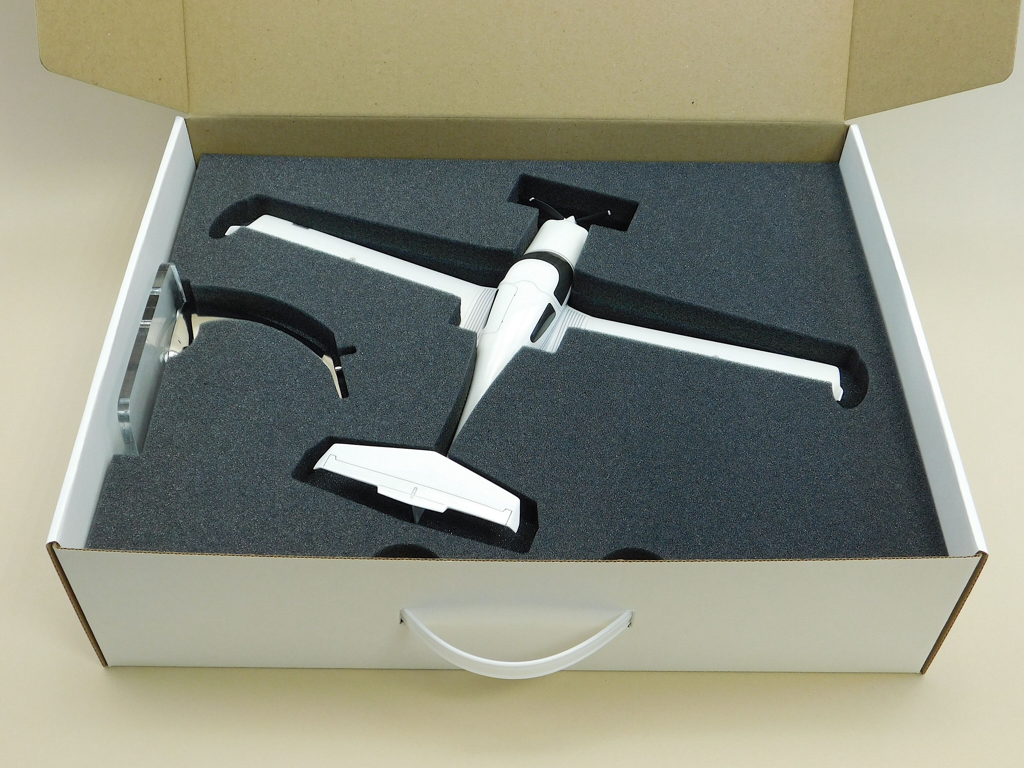 Готовая модель самолета упакована в картонную коробку с поролоновой нишей, что обеспечивает надежную защиту при транспортировке.
