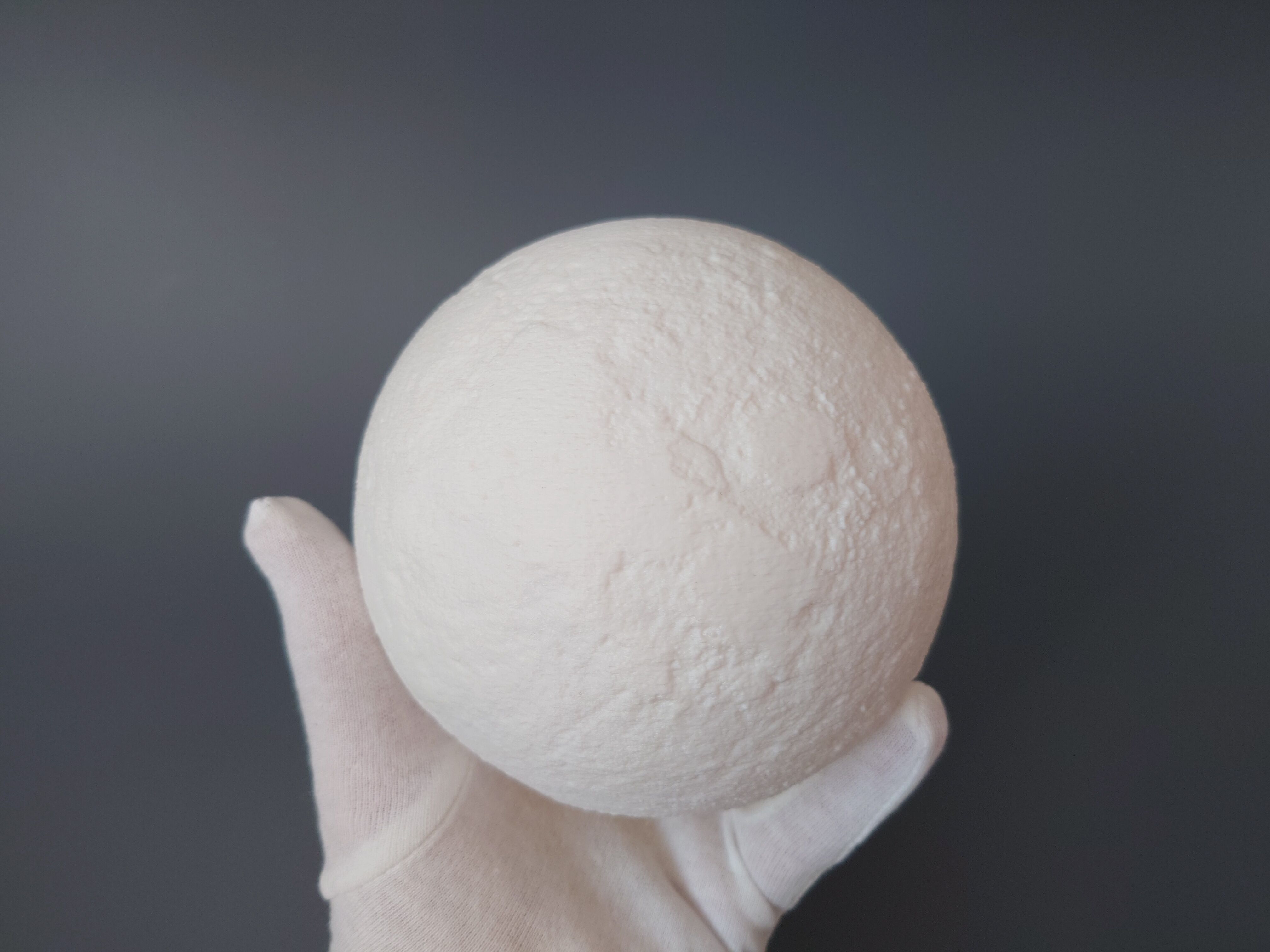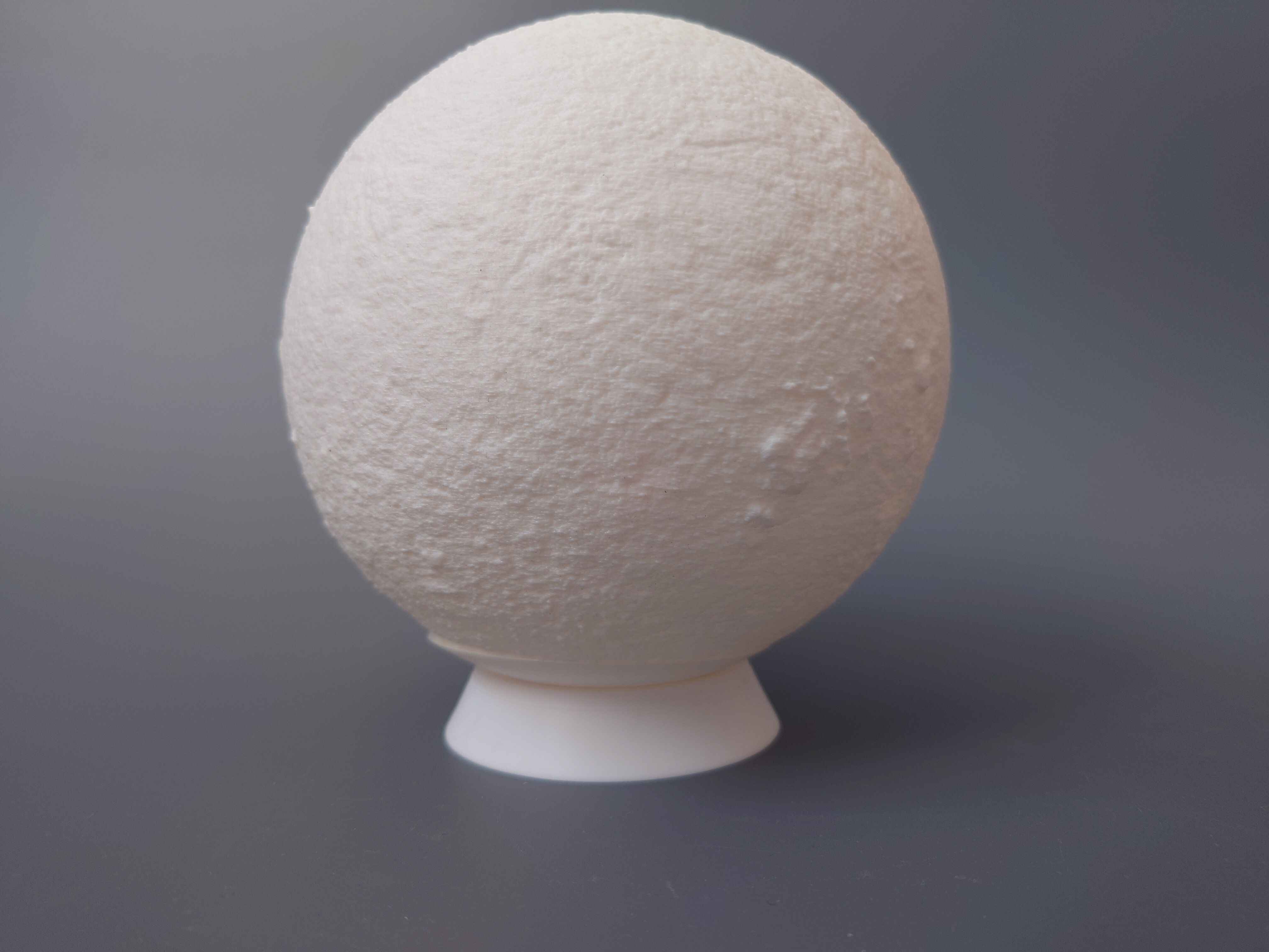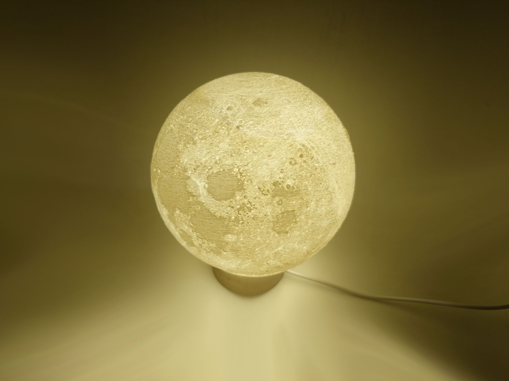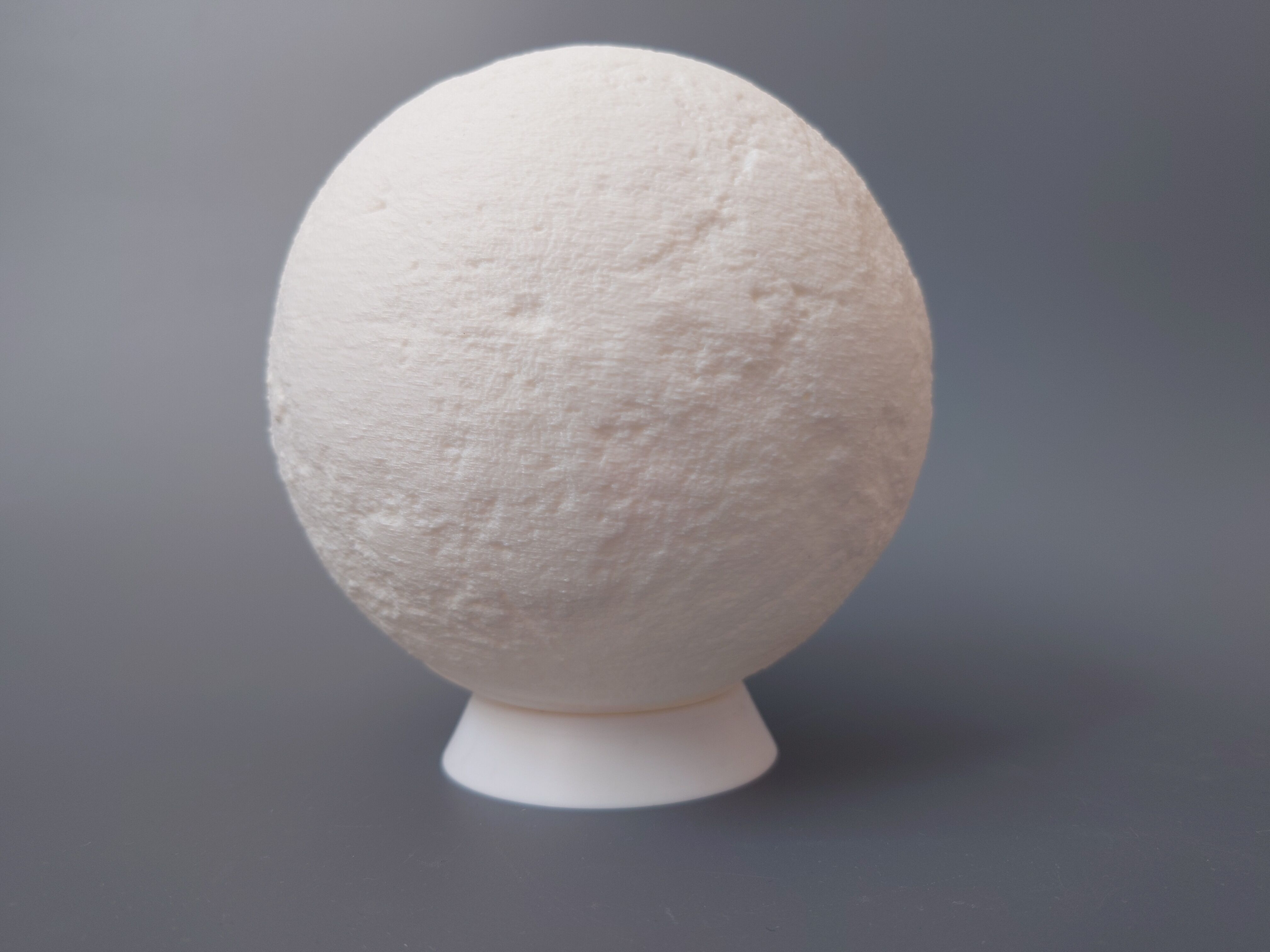Благодаря печати на 3D принтере и за счет толщин стенок шара, он великолепно показывает геометрию нашего спутника. Для лучшего эффекта установите его рядом с источником света.