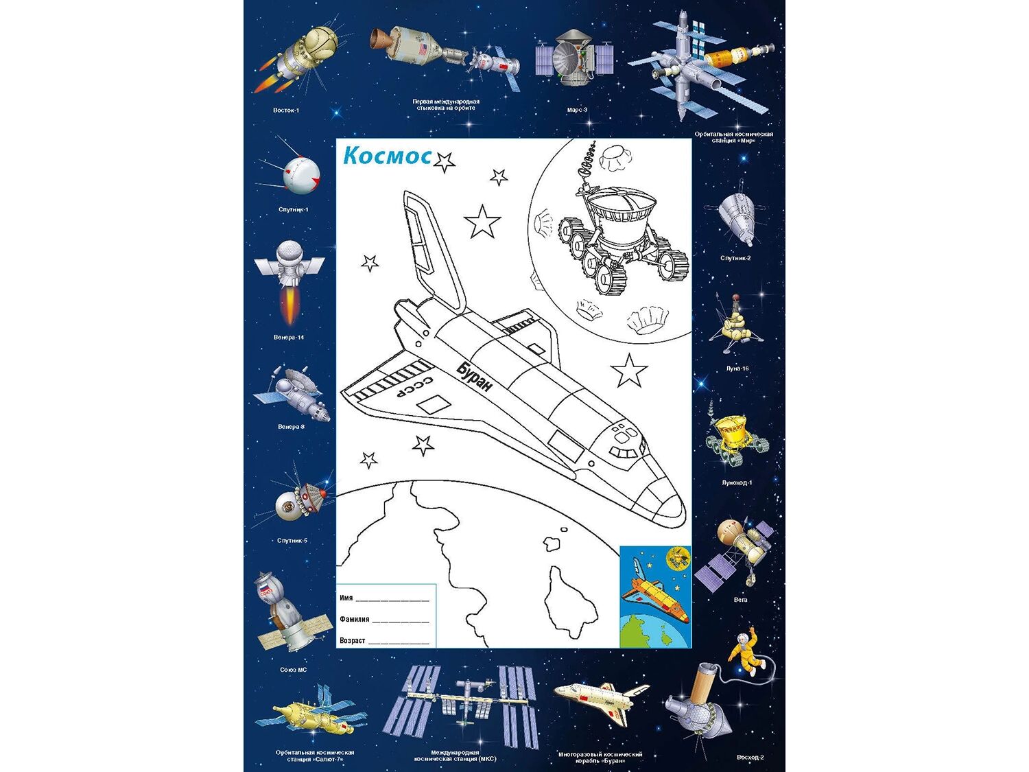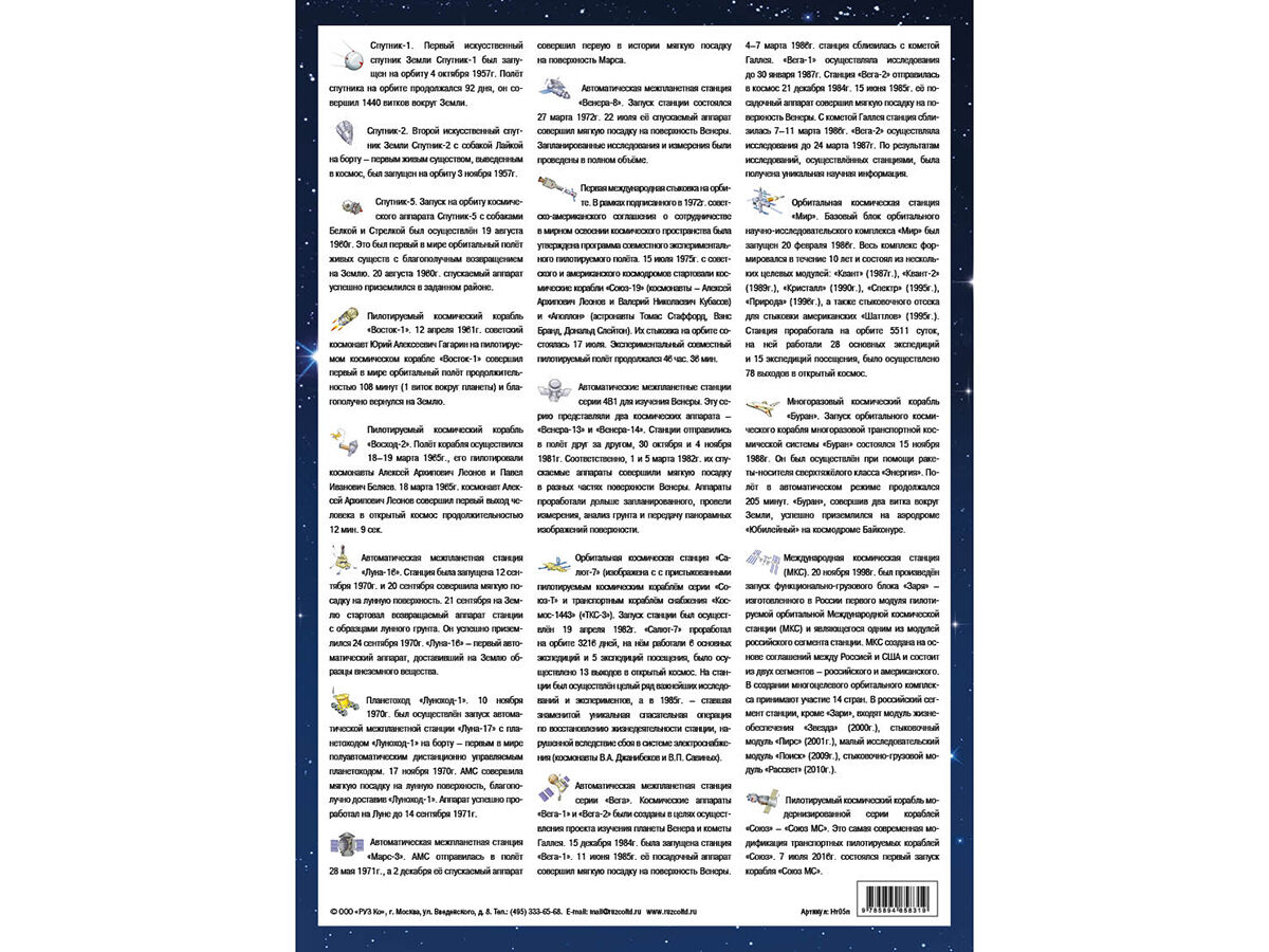 Кроме наклеек образцов кораблей и спутников дана краткая информация по каждой модели(когда был запуск, сколько проработала и т.д.). В качестве бонуса вложена раскраска по теме "Космос".