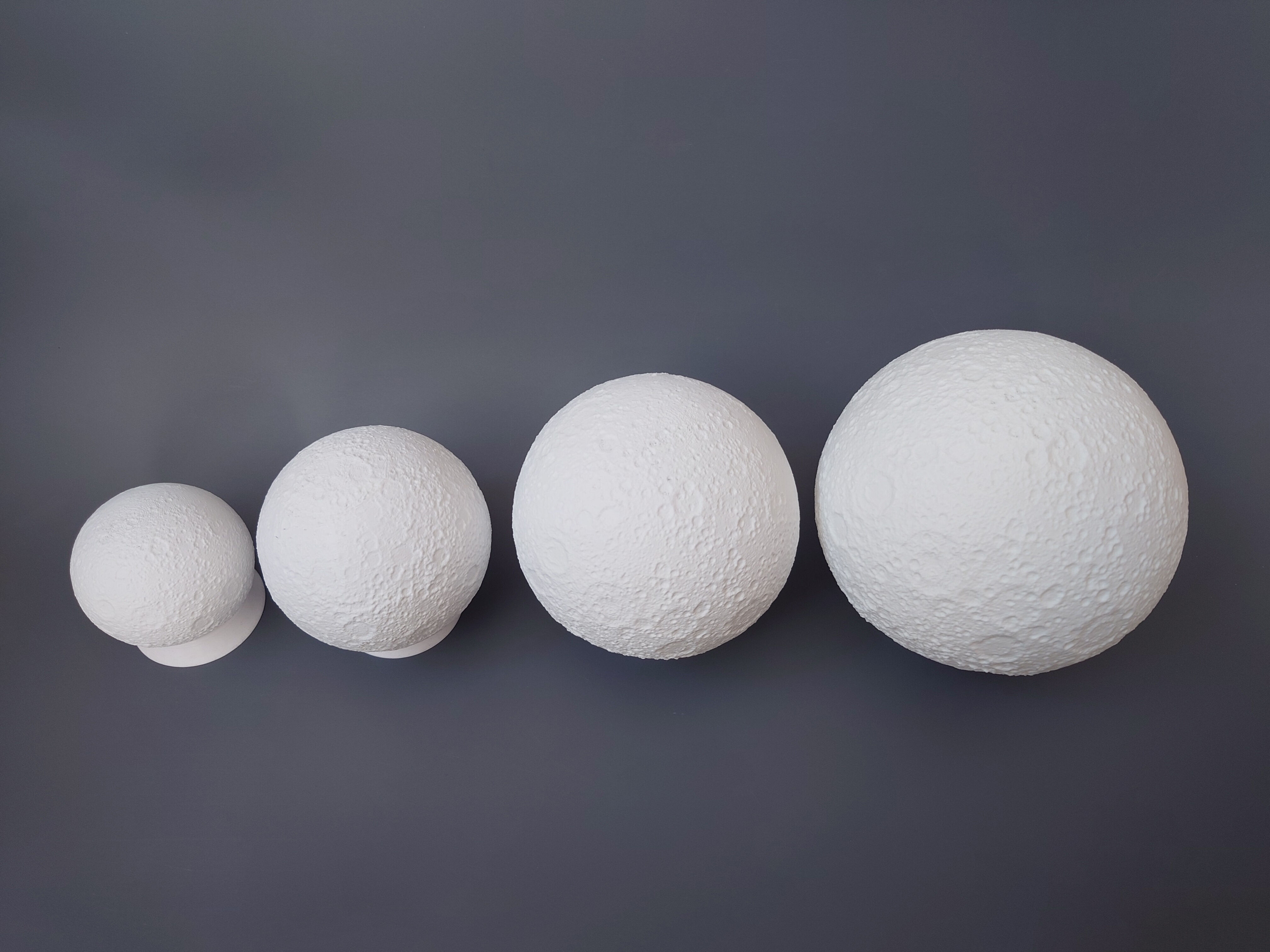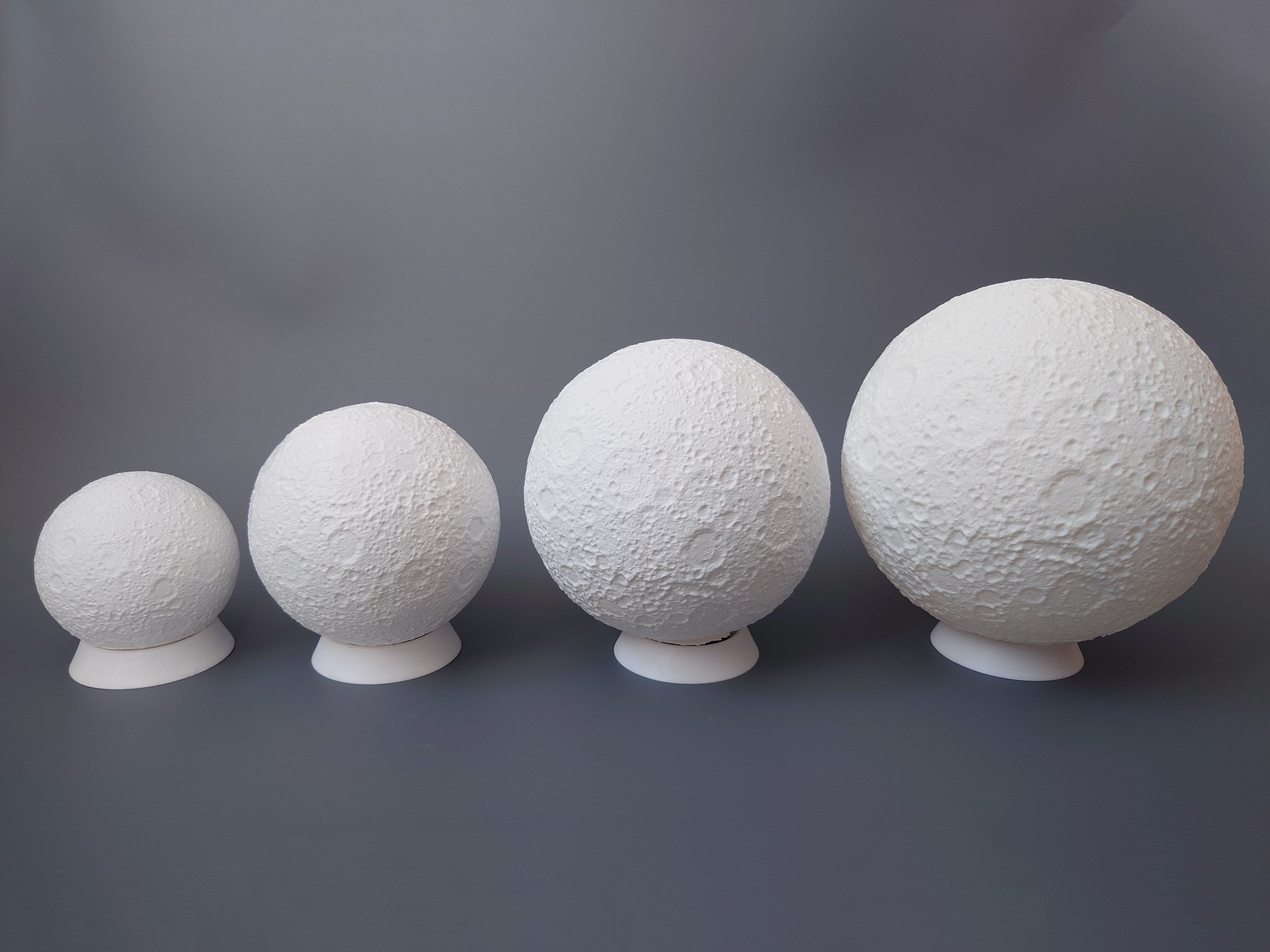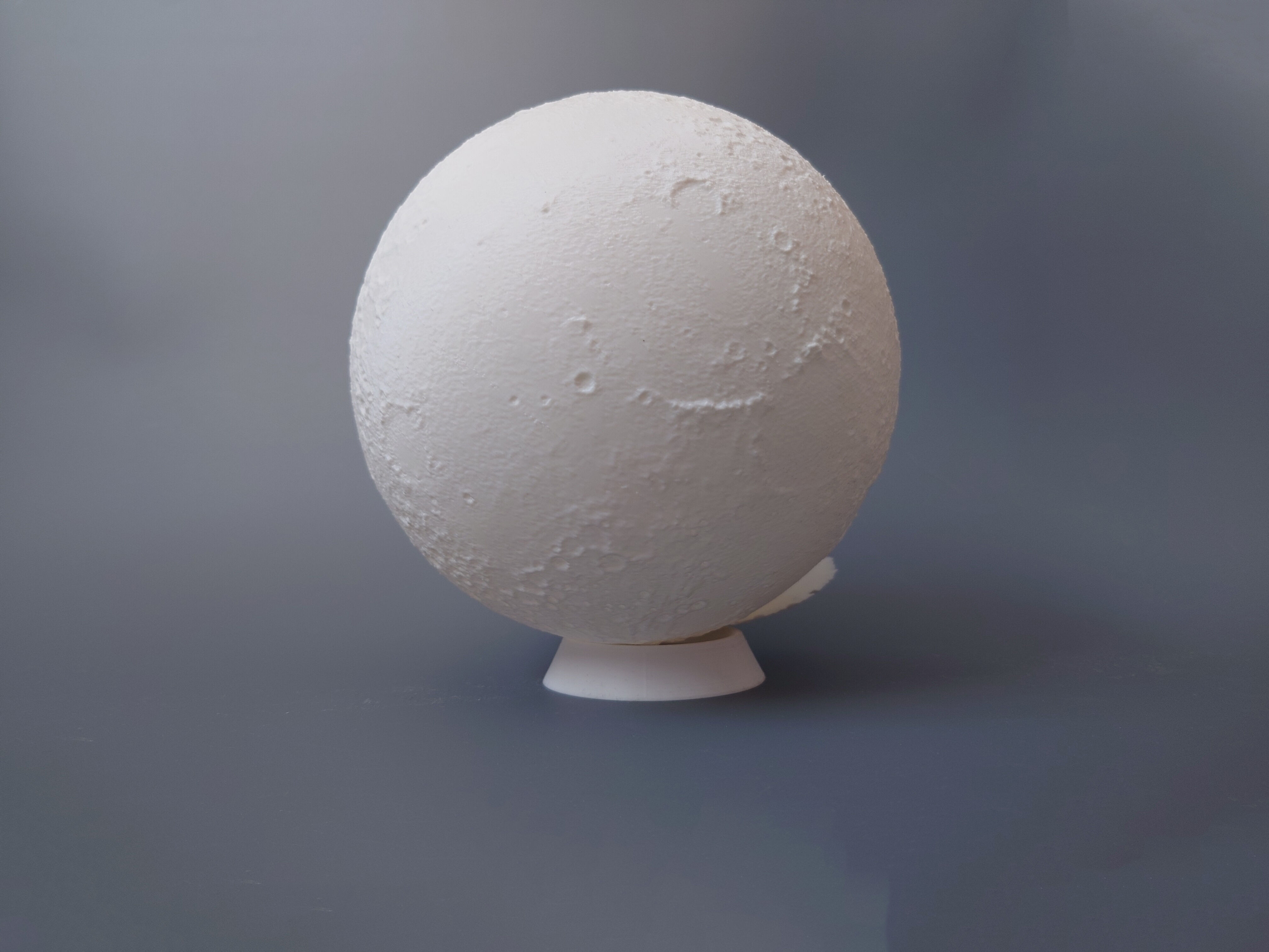 Благодаря печати на 3D принтере, шар показывает геометрию и неровности Луны, ее кратеры и моря.
