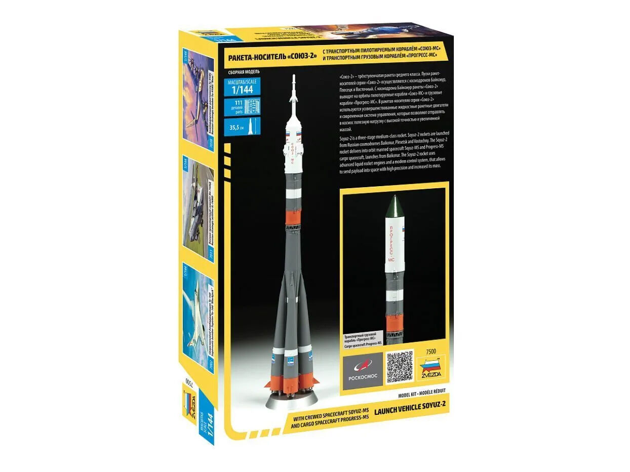 Сборная модель (Zvezda 7500) «Союз-2» - трехступенчатая ракета среднего класса. Пуски ракет-носителей серии «Союз-2» осуществляются с космодромов Байконур, Плесецк и Восточный. С космодрома Байконур ракеты «Союз-2» выводят на орбиты пилотируемые корабли «Союз-МС» и грузовые корабли «Прогресс-МС». В ракетах-носителях серии «Союз-2» используются усовершенствованные жидкостные ракетные двигатели и современная система управления, которые позволяют отправлять в космос полезную нагрузку с высокой точностью и увеличенной массой.