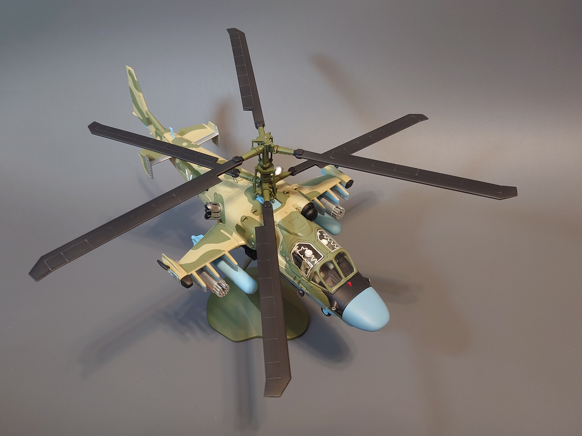 Модель вертолёта КА-52 (V) (RU) — изготавливается из композитных материалов методом литья. В комплекте идет специальная пластиковая подставка с хромированной металлической ножкой.